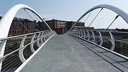 Rutherglen Bridge at Shawfield is the oldest crossing between Rutherglen and Glasgow – specifically the Bridgeton district of the city which was named after the bridge when its construction accelerated industrial growth and trade in the previously agricultural area.[16] Far more recently, a 'smartbridge' for pedestrians and cyclists was built to encourage links between the regenerating Shawfield area and Dalmarnock railway station, also in connection with the 2014 Commonwealth Games, several of the events for which were held nearby at the Emirates Arena.[252][253]