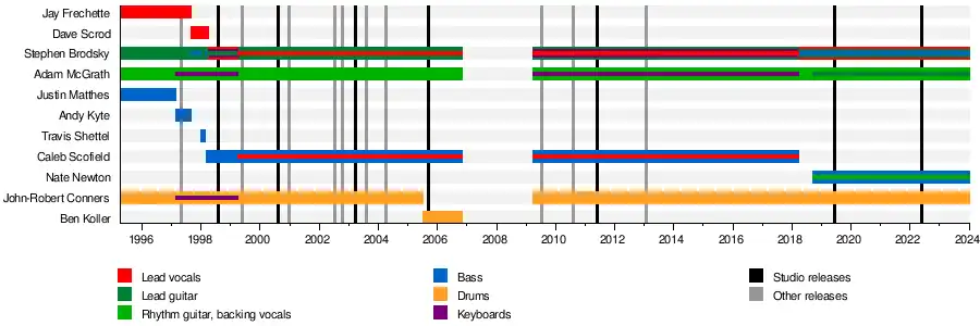 Two weeks before the band was to record their first proper full-length, Scrod left the band, pushing guitarist Stephen Brodsky to a position as vocalist, and Caleb Scofield filled in the then-vacant position on bass. Their 1998 debut studio album Until Your Heart Stops featured Brodsky as lead vocalist. The album's release was followed by extensive touring.
