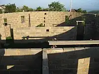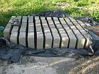 A hand-operated mechanical press creates stabilised bricks. Clay based soil mixed with five percent cement is used to form the base of the bricks.