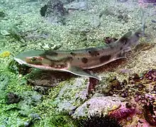 The draughtsboard shark (Cephaloscyllium isabellum) is a species of catshark, and part of the family Scyliorhinidae, so named for its "checkerboard" colour pattern of dark blotches. It is endemic to New Zealand, where it is also known as the carpet shark (which usually refers to the entire order Orectolobiformes).[2] This shark typically reaches 1 m (3.3 ft) in length and has a thick body with a broad, flattened head and a capacious mouth. Its two dorsal fins are placed far back on the body, with the first much larger than the second.
