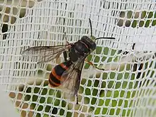 Ceriana ornata is an Australian species of hoverfly in the family Syrphidae. Resembling a wasp, this hoverfly preys on other insects including Australian native bees and the planthopper. Bottom image shown is a Potter wasp, Ancistrocerus Kereri (Dalla Torre 1904) and resembles Ceriana Ornata. C. Ornata can be identified by its distinct Y shaped antenna, large compound eyes and only has two wings.