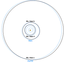 - 1 2 3 Pepe, F.; Correia, A. C. M.; Mayor, M.; Tamuz, O.; Benz, W.; Bertaux, J. -L.; Bouchy, F.; Couetdic, J.; Laskar, J.; Lovis, C.; Naef, D.; Queloz, D.; Santos, N. C.; Sivan, J. -P.; Sosnowska, D.; Udry, S. (2006). "The HARPS search for southern extra-solar planets. IX. μ Ara, a system with four planets". Astronomy and Astrophysics. 462 (2): 769–776. arXiv:astro-ph/0608396. Bibcode:2007A&A...462..769P. doi:10.1051/0004-6361:20066194. S2CID 119071803.