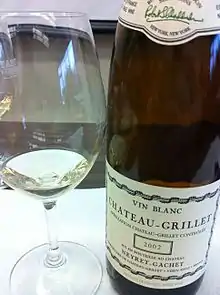 Château-Grillet is a wine-growing AOC in the northern Rhône wine region of France, near Vienne, which produces white wine from Viognier grapes. The whole appellation, which is only 3.8 hectares (9.4 acres) in size,[1] is owned by a single winery, Château-Grillet. The appellation was officially created in 1936.[2]