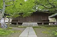 A little above the Taishaku-dō stands the Hokke-dō, a small building which is the temple's de facto main hall.[3] The building, originally built during the Muromachi period, is an Important Cultural Property.[3] It contains three more Important Cultural Properties, a gong (waniguchi), a lacquered dining table (kakeban), and a candle stand (shokudai).[3]