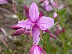 Chamaenerion fleischeri has fragrant flowers with four pointed thin dark purple sepals and four bright pink ovate petals. Flowering occurs from late June to August.[4]