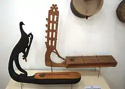 A horizontal angular harp belonging to the Mansi people. The body is hollowed out of a piece of wood, one end of it is bent upwards forming a neck, sometimes adorned with a carved bird's head. It has from five to nine (usually eight) strings producing a diatonic scale, played by plucking.