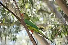 Birds represent the largest number of vertebrate species occurring within the reserve with over 165 species identified; 96 species have been banded and released as part of a long-term monitoring study in the Reserve.[2][14] Some of the Reserve's breeding residents such as Climacteris picumnus victoriae (brown treecreeper) and Daphoenositta chrysopyera (varied sittella) are listed as vulnerable under the NSW Threatened Species Conservation (TSC) Act 1995. Data from the long-term bird banding project shows a decrease in the number of brown treecreepers present. There are twenty other birds that utilize the reserve that are also listed as vulnerable under the NSW TSC Act; some examples are Grantiella picta (painted honeyeater), Polytelis swainsonii (superb parrot), Anthochaera phrygia (regent honeyeater) and the Lathamus discolor (swift parrot).[2] Under Australia's national Environment Protection and Biodiversity Conservation Act 1999 the regent honeyeater and the swift parrot are listed as endangered and the superb parrot as vulnerable.[15]
