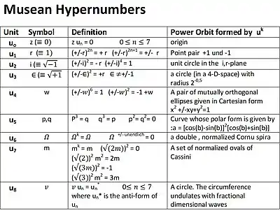 Muses also envisioned a mathematical number concept, Musean hypernumbers, that includes hypercomplex number algebras such as complex numbers and split-complex numbers as primitive types. He assigned them levels based on certain arithmetical properties they may possess. While many open questions remain, in particular about defining the relations of these levels, Muses pictured a wide range of applicability for this concept. Some of these are based on properties of magic squares,[1] and even related to religious belief. He believed that these hypernumbers were central to issues of consciousness.
