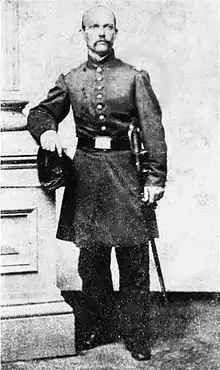 Leading the 28th, he was among the first to enter Richmond after it fell to Federal forces in early April 1865.[5] The regiment was mustered out of the volunteer service on November 8, 1865, in Texas, and returned to Indianapolis for a public reception held on January 8, 1866.[6] Russell was then transferred to the 20th U.S. Infantry Regiment in September 1866.[7] He moved with the regiment to Cincinnati, Ohio, where he died in a cholera outbreak that struck the regiment that November.[5] He is buried in Spring Grove Cemetery in Cincinnati.[3]