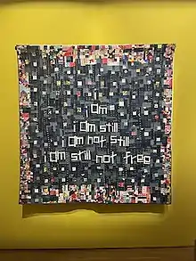 Kimber's quilts are frequently included at quilting shows and museum exhibits of quilting. The Paul Mellon Arts Center put up a show of her works in 2018.[9][26] One of her quilts inspired by the death of Eric Garner won first place at QuiltCon West in 2016,[5] and was included with other pieces by Kimber in a show on "Quilts and Human Rights" at the Pick Museum of Anthropology at Northern Illinois University.[27] Her work, still not, was acquired by the Smithsonian American Art Museum as part of the Renwick Gallery's 50th Anniversary Campaign.[28][29] This exhibition highlighted that the piece's fabrics were "sourced from mid-century textiles".[29] The description stated that "Kimber's choice to use vintage cloth and improvisational patterns draws on her memories and family history. Many of her enslaved ancestors in rural Alabama cultivated and ginned cotton. Her great-grandmother, Mamo, and other relatives expressed themselves through quilting. [...] Mamo's story was told through her quilts, and Kimber continues the thread".[29]