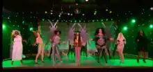 Contestants impersonating Cher for a live tribute in the episode. From left to right, Monét X Change, Aquaria, The Vixen, Kameron Michaels, Eureka, Miz Cracker, and Asia O'Hara