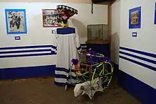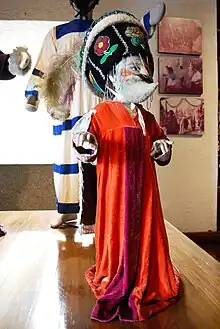 The Chinelos costume consists of four main items: a long flowing robe which usually has a rectangular shape tunic, a mask, a large plumed hat, and gloves. The flowing robe and delicate decoration has an almost feminine appearance, making the dancers appear androgynous. These robes are usually made out of velvet.[6] As the robes are extremely hot to dance in,[2] dancers wear bandannas to prevent excessive sweating and dehydration.[6] The Chinelos costume of Tlayacapan is the closest to the original developed in the 19th century. The hat is broader, less embellished with only two or three large feathers. A patterned bandana tied around the head is worn underneath the hat. The tunic is a white robe of white or blue, which is generally not embroidered. The rectangular cape has an image of the Virgin of Guadalupe .[2]