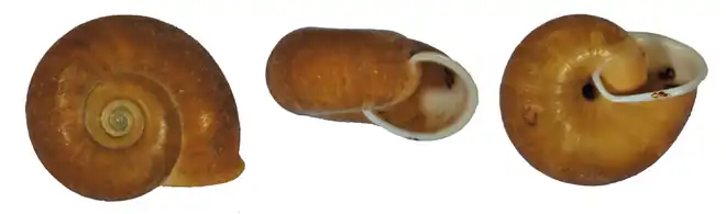 The shell is of moderate size for the genus, brown, with hairs, spire somewhat elevated, umbilicated, the ends of the peristome connected with a thin callus.[2] The width of the shell is 24 mm.[2]