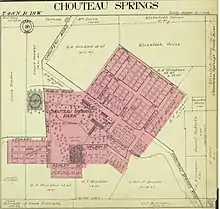 Chouteau Springs was officially platted in 1886 beside a mineral spring,[20] and named after Jean Pierre Chouteau, the original owner of the town site.[21]