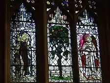 The three upper lights on the South side (on the right as one faces the window). "Valour"- St George in the centre with St Alban and St Edmund. The notes describes St Alban as "The Martyr-and the first in England to be faithful unto death" and St Edmund "King of the East Angles and Martyr, A.D.870- Slain by the Danes (One of the Patrons of English Valour all through the Middle Ages)"[3]