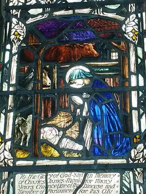 Fourth and final tier of five lights Scenes from the lives of the five Saints shown above. These depict events which are associated with each of these five saints. For St Columba, Whall chose to depict Columba with a stork, reminding us that Columba had to suffer exile from Ireland and would have missed his homeland and for St Aidan, he depicts the shield of the first Church of Wattles on Lindisfarne with the motto "Simile est grano sinapis" / "It is like a grain of mustard seed", thus reminding us that Aidan was to help sow " the seed of Northern Christianity" (mustard was grown on Lindisfarne). For Hilda, Whall depicts St Aidan visiting St. Hilda's school and for Cuthbert we have the motto "Et factus in arborem magnam" /"It becomes a great tree (Gloucester Cathedral)". Finally Whall depicts Chad placing his Bishopric at the disposal of Theodore. The window is in memory of John Dearman Birchall (1828–1897) of Bowden Hall near Gloucester and was given by his son.[2][3]