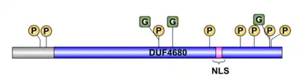 A stretch of five positively charged lysines, indicating a nuclear localization sequence, can be found at positions 133-137 of the amino acid sequence.[15]