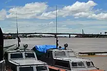 The Chroy Changva Bridge (also known as the Cambodian-Japanese Kizuna Friendship Bridge) is a 709-meter bridge that crosses the Tonle Sap River in Phnom Penh, originally built in 1963, with Japanese aid. Severely damaged during the civil war in 1972 and 1973, it remained closed until it reopened on the 26th of February 1994 [1] About 10 km north of it there is another bridge the Prek Kdam Bridge, then the Prek Pnov Bridge and no more bridges on the Tonle Sap, a temporary bridge should open in April 2018, the construction of a concrete bridge should start just after that.[2]