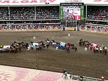 ![]() Chuckwagons racing toward the finish line at the 2009 Calgary Stampede | |