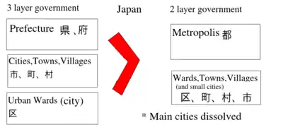 The Chukyo Metropolis proposals (中京都構想 and ja:岐阜愛知新首都構想) are proposed transformations of the Aichi prefecture into a metropolis.[1] Aichi's prefectural governor, Hideaki Omura, formed the Chukyo Isshin no Kai (ja:中京維新の会) or Chukyo Metropolitan Area Renewal Association in 2012.[2] The latter plan is an alternate that also incorporates Gifu prefecture in the Metropolis.