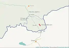 By the time of Indian independence in 1947, the Indians appear to have conceded part of the valley of Chepzilung to the Tibetans.[lower-alpha 2] When independent India defined its boundaries in 1954, it also withdrew from the Panglung river east of Chepzi, and set the watershed ridge as the boundary. On the Pare Chu river itself, the Indian-defined border is five miles south of Chumar, which is approximately two miles north of Chepzi.[11] This allows the Tibetan graziers unrestricted access to both the tributary rivers of Pare Chu at Chepzi.