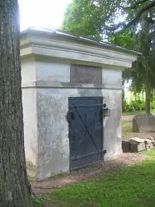The church is surrounded by a graveyard, which acts as the primary graveyard for the parishes of Vantaa. Up until 1793, the graveyard remained constrained to its original size, until an inspection deemed it too crowded. Since then, it has been regularly expanded to suit the needs of the growing population. The graveyard's current area is about 10 hectares (25 acres). Its most notable grave is the mausoleum of Swedish naval commander Carl Olof Cronstedt.[5] Eddie Boyd, an American blues pianist, singer and songwriter, best known for his recordings in the early 1950s, is also buried in the graveyard.[6]