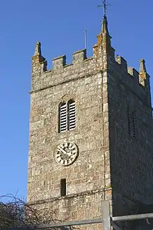 The first part of the current church, including the chancel and the south porch, was built around 1250.[4] The south chapel was added in the early 14th century by the Lord of the Manor, Sir William Prouz, whose effigy also lies in the church. The church tower was built in the late 14th century. The North aisle was likely built by a member of the Dinham family in the mid fourteenth century, and contains square perpendicular windows, along with effigies of a knight and lady.[3] The effigies are made of limestone and have a large amount of carved graffiti.[5]
