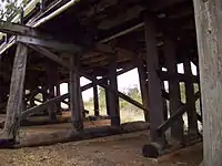 Clackline Bridge is a timber bridge spanning the Clackline Brook and the former Eastern Railway alignment, in the Shire of Northam, 77 kilometres (48 mi) east of Perth. Constrained by the topography of the site, the route of the Eastern Railway tracks, and the previous alignment of Great Eastern Highway, the bridge has a unique curved and sloping design. It has 18 spans over a 126-metre (413 ft) length, with a 1 in 20 slope and a horizontal curve radius of 400 metres (1,300 ft). There are 18 numbered piers, starting from pier 1 at the eastern end.[1]: 8 The double tracks of the Eastern Railway, which linked Perth and Northam until its removal in 1981,[1]: 7 passed between piers 16 and 17. Piers 14 to 17 are parallel to that former railway, at an angle of approximately 40 degrees to the bridge. This resulted in spans of various lengths: 7.6 metres (25 ft) heading out from the western abutment, then a 14-metre (46 ft) span between piers 16 and 17, followed by a 4.8-metre (16 ft) length, two 5.2-metre-long (17 ft) spans, and 13 spans of 6 metres (20 ft).[1]: 8