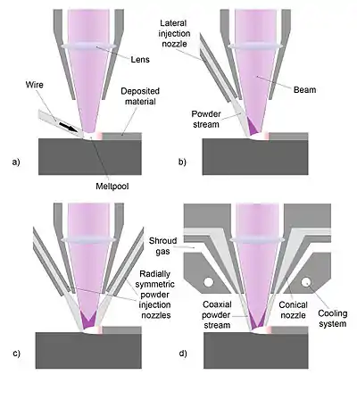 A laser is used to melt metallic powder dropped on a substrate to be coated. The melted metal forms a pool on the substrate; moving the substrate allows the melt pool to solidify in a track of solid metal. Some processes involve moving the laser and powder nozzle assembly over a stationary substrate to produce solidified tracks. The motion of the substrate is guided by a CAM system which interpolates solid objects into a set of tracks, thus producing the desired part at the end of the trajectory.