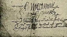 Clan MacDonald of Dunnyveg, also known as Clan Donald South, Clan Iain Mor, Clan MacDonald of Islay and Kintyre,[2] MacDonalds of the Glens (Antrim) and sometimes referred to as MacDonnells, is a Scottish clan and a branch of Clan Donald. The founder of the MacDonalds of Dunnyveg is Eòin Mòr Tànaiste Mac Dhòmhnaill, a son of Iain Mic Dhòmhnaill (John of Islay, Lord of the Isles) and Margaret Stewart of Scotland, daughter of King Robert II.[3] Members of the clan actually pronounced and spelled their name M'Connall due to the Gaelic pronunciation of the name Mac Domhnuill thus giving rise to the surname McConnell and its variants.[4] While historically recognised as a clan by the Court of the Lord Lyon, it is now an armigerous clan as it no longer has a chief. The last chief was Sir James MacDonald, 9th of the Clan MacDonald of Dunnyveg or Clan Donald South, who died in London in 1626.