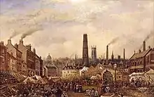 One of the Derby exhibits was "Fair-day in the Morledge", depicting a bustling city centre Easter fair, at Derby, see image in the right hand panel. This picture, now in the possession of the Derby Museum and Art Gallery, was exhibited at Mr. Keene’s picture exhibition in Derby,[17] according to the Derby Mercury of 31 May 1882,[18] by T. C. Moore but is now attributed to Claude T. S.