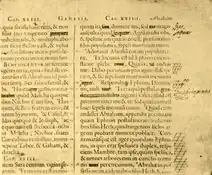 The Clementine Vulgate was printed on 9 November 1592,[29] in folio format,[30] with an anonymous preface written by Cardinal Robert Bellarmine.[lower-alpha 4][29][19] It was issued containing the Papal bull Cum Sacrorum of 9 November 1592,[32] which asserted that every subsequent edition must be assimilated to this one, that no word of the text may be changed and that variant readings may not be printed in the margin.[33] Most of the misprints of this edition were removed in a second (1593) and a third (1598) edition.[29]