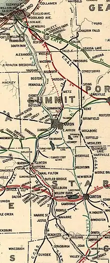 At the time of its completion, the Valley Railway had 75 miles (121 km) of main line track, 19 miles (31 km) of branch track, 35 miles (56 km) of siding, and a 2-mile (3.2 km) spur from Mineral City to a nearby Sieberling-owned coal mine.[30] It linked northeast Ohio's three largest cities, creating a regional transportation corridor.[31]