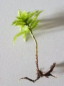 Climacium dendroides, also known as tree climacium moss,[1][2] belongs in the order Hypnales[3] and family Climaciaceae,[4] in class Bryopsida and subclass Bryidae. It is identified as a "tree moss" due to its distinctive morphological features, and has four species identified across the Northern Hemisphere. The species name "dendroides" describes the tree-like morphology of the plant, and its genus name came from the structure of the perforations of peristome teeth.[1] This plant was identified by Weber and Mohr in 1804.[5][1] They often have stems that are around 2-10 cm tall and growing in the form of patches,[2] looking like small palm-trees.[1] They have yellow-green branches at the tip of stems. The leaves are around 2.5-3 mm long, with rounder stem leaves and pointier branch leaves.[2] Their sporophytes are only abundant in late winter and early spring, and appears as a red-brown shoot with long stalk and cylindrical capsules.[2]