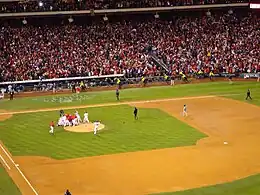 The city's sole existing Major League Baseball (MLB) team is the Philadelphia Phillies. Founded in 1883, the team is the oldest continuous, one-name, one-city franchise in all of professional American sports.[18] The Phillies compete in the National League East and have won the World Series twice, in 1980 and 2008. The Phillies have won eight National League pennants and eleven NL East division titles. In 2007, the Phillies lost a game for the 10,000th time in franchise history; according to the Elias Sports Bureau, no professional sports franchise in any sport has lost more games.[19] For its first 30 years, the franchise often finished in the middle of the National League. Led by pitcher Grover Cleveland Alexander, the franchise appeared in the 1915 World Series and made strong finishes in 1916 and 1917. After trading Alexander in 1917, the franchise had one of the worst stretches in professional sports history, as it managed just one winning season between 1918 and 1948. The "Whiz Kid" Phillies, led by pitcher Robin Roberts, reached the 1950 World Series, but the team was swept by the New York Yankees. The team finished towards the middle of the pack for much of the 1950s and 1960s. After a down period in the early 1970s, third baseman Mike Schmidt and pitcher Steve Carlton led the Phillies to six playoff appearances in eight years. The Phillies won their first World Series in 1980, defeating the Kansas City Royals in six games. The Phillies also appeared in the 1983 World Series, but lost to the Baltimore Orioles. The franchise had just one winning season between 1987 and 2000, although the 1993 Phillies appeared in the 1993 World Series, losing to the Toronto Blue Jays. The franchise experienced a resurgence starting in 2001, though it did not make the playoffs until 2007. From 2007 to 2011, the Phillies made the playoffs for five straight seasons, winning the 2008 World Series over the Tampa Bay Rays and also appearing in the 2009 World Series. After an 11 year playoff drought, the Phillies reached the 2022 World Series, losing to the Houston Astros in six games.