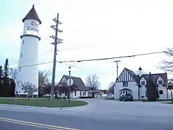 In early 1926, Detroit developer Will St. John platted an exclusive residential subdivision known as "The Colony," marketed to well-off professionals as a secluded neighborhood with ready access the Lake Saint Clair. The subdivision had 147 lots. That same year, St. John had the Chicago Bridge & Iron Company erect a water tower to service the subdivision. As an advertising gimmick, St. John clad the tower with a lighthouse-like outer skin, even adding a beacon on top. He also constructed a gatehouse nearby.[2]