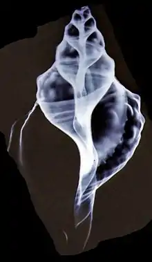 An X-ray image of a shell of a marine Triton snail (Charonia), showing the slightly sinuous line of the central columella, reaching from the top of the image (the apex of the shell) to the bottom (the siphonal canal)