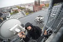 In August 2000, Consume was founded in London England as "collaborative strategy for the self provisioning of a broadband telecommunications infrastructure". Founded by Ben Laurie and others, Consume aimed to build a wireless infrastructure as alternative to the monopoly-held wired metropolitan area network.[11] Besides providing Wi-Fi access in East London, Consume installed a large antenna on the roof of the former Greenwich Town Hall and documented the states of wireless connections in London. Consume created political pressure on municipal authorities, by staging public events, exhibitions, encouraging consumers to set up wireless equipment and setting up temporary Wi-Fi hotspots at events in East London. While Consume generated sustained media attention, it did not establish a lasting wireless community network.[13]