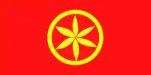 The flag of the organization was a red field with a thin golden circle and a golden sun symbol within. The colors were those of the Leonese flag and the sun symbol represented the South Astur people, origin of Leonese region, according to Conceyu Xoven.