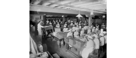 As the domestic industry grew, production became increasingly mechanised, and the composition of the workforce changed as a result. While in the 1880s, confectionery was a male-dominated industry, by 1900 women and girls accounted for about half of all confectionery workers. By 1920, they outnumbered men and boys two-to-one.[2]