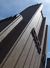 The Oldest House setting was based on brutalist architecture, a style utilizing large concrete blocks popularized in the 1950s and used in many government buildings at the time. The game's world design director, Stuart Macdonald, described brutalism as a good science-fiction setting, as it has "this sense of power, weight, strength and stability to it", and when the Oldest House's geometries are affected by the Hiss, "it makes for a really good contrast with the impossible architecture".[16] The relatively flat colors of the background walls made it an ideal canvas to showcase other design and lighting effects in the game. It served well into the telekinesis powers of the game, as the concrete walls would be used in lieu of a target object when the player throws debris at foes via telekinesis, and the initially pristine spaces end up showing the results of a large, destructive battle.[16] Among real-world influences in the game's architecture is 33 Thomas Street, formerly known as the AT&T Long Lines Building, a windowless building in the center of New York City. Macdonald used this building as a modern example of brutalism, and created the Oldest House as a "bizarre, brutalist monolith" to house the FBC.[16] Other real-world locations used as inspiration included the Boston City Hall, the Andrews Building at the University of Toronto Scarborough, and the Met Breuer.[16]