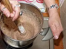 Soups (minestre) are an important part of the Corsican cuisine.[40] The minestra, or zuppa corsa, akin to the Italian minestrone, is a soup with beans, potatoes, garlic, onion, mangelwurzel, cabbage and tomatoes, whose grease is given by a ham bone and shortening.[41] Among other traditional soups are the bread soup (minestra di pane cotto),[42] similar to the Italian pancotto; the soup with fresh brocciu (minestra di casgiu frescu, from Carpineto);[43] with aged brocciu (minestra di brocciu seccu);[44] with red beans and leek (minestra di fasgiolu e di porri, from Niolo).[42] On Maundy Thursday, meat is replaced with chickpeas by the minestra incu i ceci di Iovi Santu.[41] In the island is also prepared the Stufatu, a soup whose main ingredient is either wheat flour (stufatu di farin'di granu) or corn flour (stufatu di farin'di granonu).[45] Brilluli is a porridge whose ingredients are chestnut flour, water and goat milk.[46]