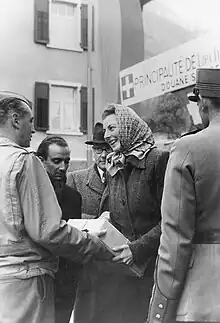 During World War II, Princess Georgina had concerns for prisoners of war and travelling by bicycle when the country suffered a gasoline shortage. When the war ended in 1945, Princess Gina helped the refugees by making soup and bathing children on the national border at Schaanwald.[4] On 22 June 1945, at her imitative, the Liechtenstein Red Cross was founded, and she was president from 1945 to 1985 and became honorary president in 1985.[5][4] The following year, she founded a counseling center for mothers in Liechtenstein. In 1948, the Liechtenstein Red Cross's family welfare organization was founded. In 1956, Princess Gina opened the Red Cross's first children's home in Triesen. In 1972, the Red Cross's rescue service was established.[5]