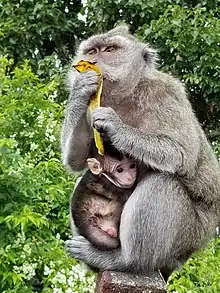 Long-tailed macaque and her young eating a banana in Mauritius