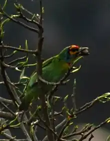 The crimson-fronted barbet (Psilopogon rubricapillus), also called Sri Lanka barbet, is an Asian barbet endemic to Sri Lanka where it inhabits tropical moist lowland forests up to 1,300 m (4,300 ft) elevation.[1]
