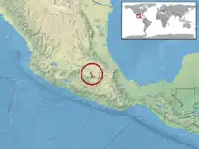 It is found in central Mexico in the Sierra Ajusco and the Sierra de Monte Alto of the Transverse Volcanic Cordillera in the states of México and Morelos at elevations exceeding 2,900 m (9,500 ft) in temperate boreal forests. The type locality given is "about 55 km. SW México (city), near Tres Marías (Tres Cumbres), Morelos [Mexico], elevation about 10,000 ft." (3,000 m)[2]