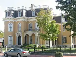 Culbertson Mansion State Historic Site is located in New Albany, Indiana by the Ohio River. It was the home of William Culbertson, who was once the richest man in Indiana. Built in 1867 at a cost of $120,000, this Second Empire-style mansion has 25-rooms within 20,000 square feet (1,900 m2), and was completed in November 1869. It was designed by James T. Banes, a local architect. Features within the three-story edifice include hand-painted ceilings and walls, frescoed ceilings, carved rosewood-grained staircase, marble fireplaces, wallpaper of fabric-quality, and crystal chandeliers. The original tin roof was imported from Scotland. The displays within the mansion feature the Culbertson family and the restoration of the building. The rooms on the tour are the formal parlors, dining rooms, bedrooms, kitchen, and laundry room.[2]