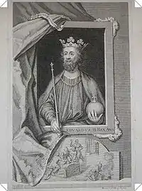 Fictional portrait of King Edward II of England. The scene on the lower part shows the king being murdered. Ca. 1700 AD