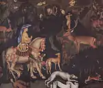 An example of a dog representing marital fidelity is present in Jan van Eyck's Arnolfini Portrait. An oil painting on oak panel dated 1434 by the Early Netherlandish painter Jan van Eyck, it is a small full-length double portrait,[13] which is believed to represent the Italian merchant Giovanni di Nicolao Arnolfini and his wife,[14] presumably in their home in the Flemish city of Bruges. The little dog symbolizes faithfulness, devotion or loyalty,[13] or can be seen as an emblem of lust, signifying the couple's desire to have a child.[15] Unlike the couple, the dog looks out to meet the gaze of the viewer.[16] The dog could also be simply a lap dog, a gift from husband to wife. Many wealthy women in the court had lap dogs as companions, reflecting wealth or social status.[17] During the Middle Ages, images of dogs were often carved on tombstones to represent the deceased's feudal loyalty or marital fidelity.[18]