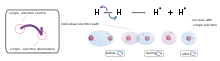 Homolytic bond cleavage is a process where the electron pair comprising a bond is split, causing the bond to break. This is denoted by two single barbed curved arrows pointing away from the bond. The consequence of this process is the retention of a single unpaired electron denoted by a dot on each of the atoms that were formerly joined by a bond. The single electron movement can be denoted by a curved arrow commonly referred to as a fish hook.[9] These single electron species are known as free radicals. Heat or light are required to provide enough energy for this process to occur.[10]